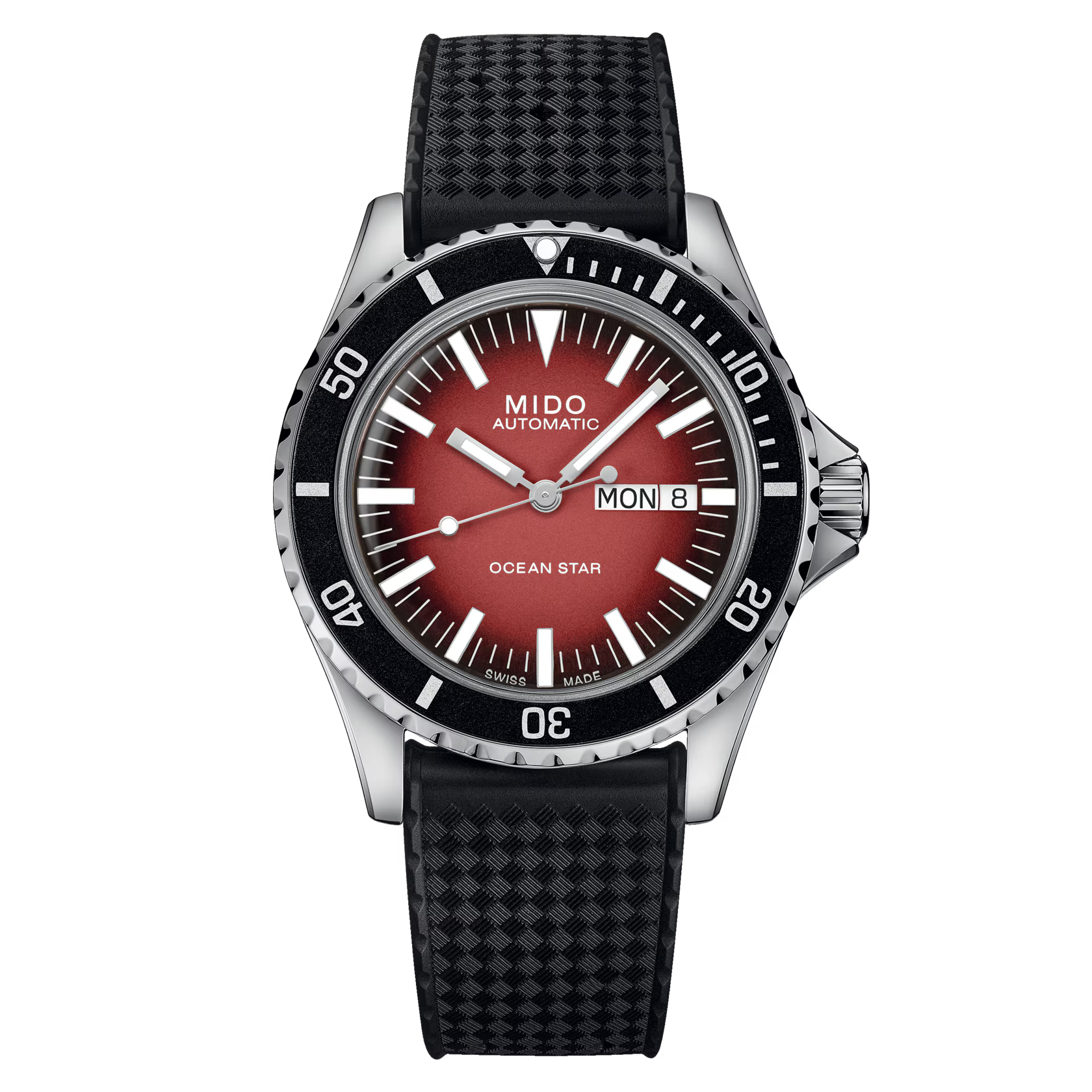 El Mido Ocean Star Tribute Gradient combina el espíritu vintage de los relojes de buceo de los años 60 con la tecnología suiza moderna. Su esfera roja degradada, que se oscurece hacia el borde, y el bisel cerámico negro unidireccional le dan un carácter distintivo y audaz. Impulsado por el calibre automático Calibre 80 con 80 horas de reserva de marcha, es una pieza pensada para quienes buscan estilo, precisión y rendimiento bajo el agua.