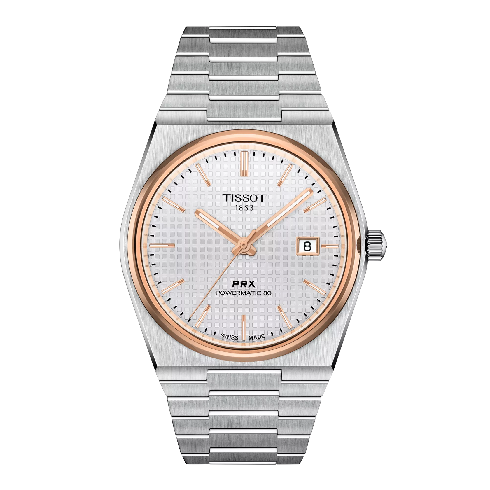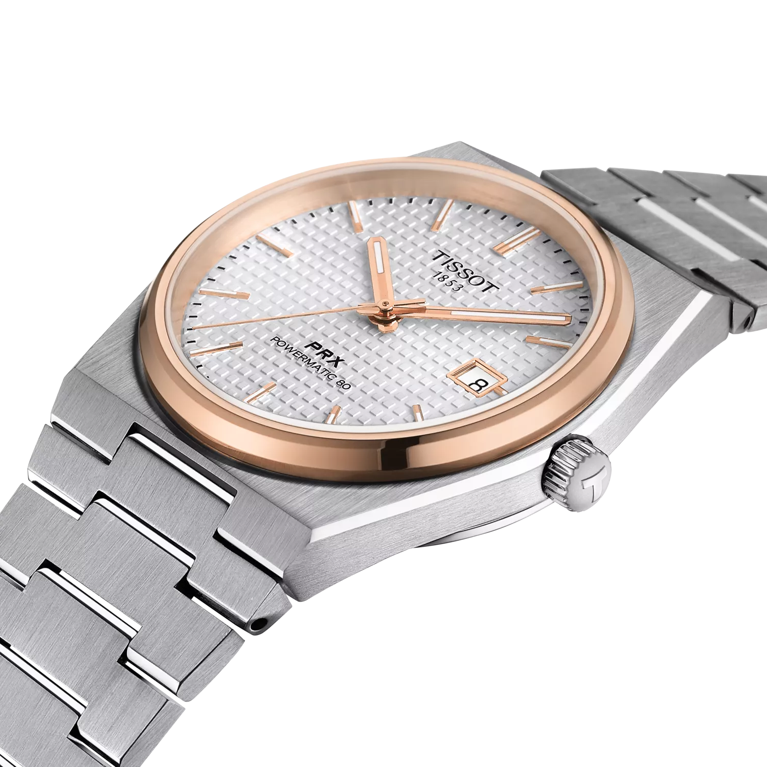 El Tissot PRX Powermatic 80 bicolor combina el diseño icónico de los años 70 con detalles en PVD dorado que le aportan un toque de lujo moderno. Su esfera plateada con patrón waffle, el brazalete integrado y el movimiento automático suizo hacen de este modelo una pieza elegante, versátil y sofisticada para uso diario o formal.